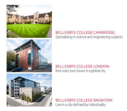 Hàng năm, có hơn 50.000 sinh viên đến từ 120 quốc gia theo học chương trình đào tạo của Study Group và được nhận vào các trường Đại học mong muốn. Đến với Study Group, học sinh sẽ được học tập ngay trong khuôn viên của trường Đại học, môi trường học tập với sĩ số lớp nhỏ, được quan tâm chi tiết trong mọi vấn đề học tập và trang thiết bị học tập hiện đại. Study Group cung cấp các khóa học đa dạng: tiếng Anh, Dự bị Đại học, Năm 1 đại học dành cho SV quốc tế, Dự bị Thạc sĩ với chất lượng giảng dạy cao và đội ngũ giáo viên giàu kinh nghiệm tại 19 trường đại học danh tiếng trên toàn Vương quốc Anh: Bellerbys College, International Study Centres, Coventry University London, Durham University, Istituto Marangoni, Keele University, Kingston University, London, Lancaster University, Leeds Beckett University, Liverpool John Moores University, Royal Holloway, University of London, University of Sheffield, University of Huddersfield, University of Leeds, University of Leicester, University of Lincoln, University of Strathclyde, University of Surrey, University of Sussex. Bellerbys College Bellerbys College là trường Cao đẳng quốc tế hàng đầu tại Vương quốc Anh với 61 năm kinh nghiệm đào tạo và hỗ trợ sinh viên quốc tế vào những trường ĐH danh tiếng ở Anh cũng như trên thế giới. Trường có 03 canpus tại: Brighton, Cambridge, London. Các chương trình đào tạo + yêu cầu đầu vào gồm: