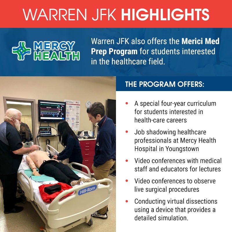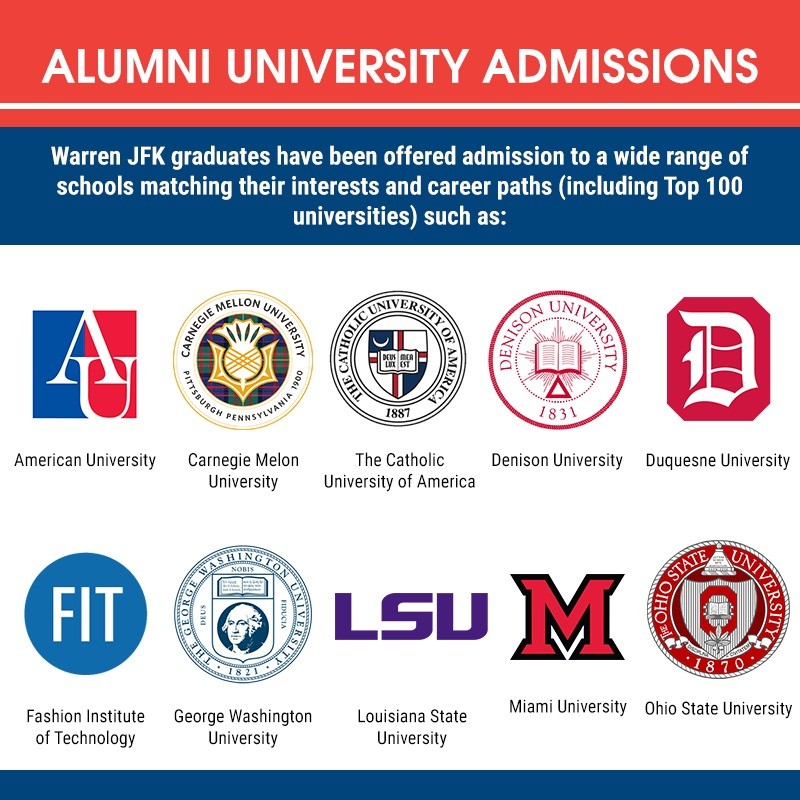 Thế mạnh các nhóm ngành học: 1/ Theo học chương trình phổ thông 4 năm tại JFK, tốt nghiệp với bằng Tú tài Hoa Kỳ, tích lũy trước một số tín chỉ của chương trình đại học. 2/ Trường có khoá học Med-PREP cho 4 năm phổ thông được thiết kế riêng cho học sinh có nguyện vọng theo học ngành Y khoa tại bậc đại học sau này. Học sinh của khoá học này có cơ hội tham gia vào các buổi nói chuyện với bác sĩ và nhân viên y tế, trải nghiệm môi trường làm việc trong các cơ sở y tế trong vai trò tình nguyện viên, trực tiếp quan sát tiến trình phẫu thuật và khám nghiệm, được học các quy trình y tế căn bản và tích lũy kinh nghiệm làm việc dưới sự kèm cặp của nhân viên y tế.