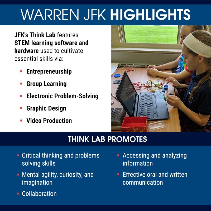 3/JFK's THINK LAB, cung cấp nhiều chương trình khác nhau để giúp học sinh học các kiến thức và kỹ năng cần thiết liên quan đến STEM. Thông qua các dự án trong các lĩnh vực khác nhau, bạn có thể học Entrepreneurship, Collaborative Group Learning, LittleBits Electronic Problem-sloving, Graphic Design, Video Production … Thông qua khóa học LAB, bạn có thể rèn luyện kỹ năng tư duy sáng tạo, kỹ năng giải quyết vấn đề, kỹ năng phân tích thông tin, trí tò mò và trí tưởng tượng, kỹ năng viết và giao tiếp hiệu quả, và kỹ năng hợp tác.