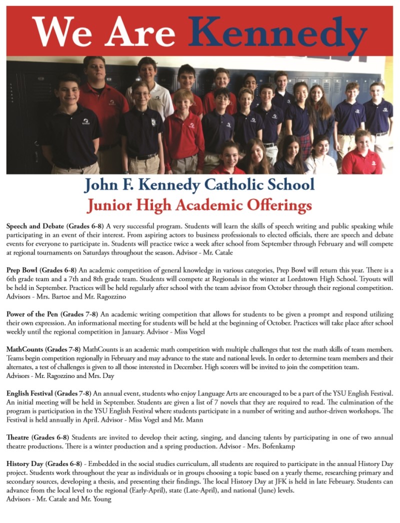 Giới thiệu John F. Kennedy Catholic School (JFK) là trường trung học tư thục dành cho học sinh từ lớp 9 đến lớp 12, được thành lập từ năm 1964, có bề dày truyền thống và lịch sử vì đã có bề dày lịch sử hơn 50 năm, toạ lạc tại thành phố Warren, bang Ohio, miền Đông Hoa Kỳ. Các cơ quan kiểm định của các trường JFK là Hiệp hội Kiểm định Trường Công giáo Ohio (OCSAA), Hiệp hội Giáo dục Công giáo Quốc gia (NCEA) và Bộ Giáo dục Ohio. Trường John F. Kennedy, cũng được chọn là Trường Học thuật Hàng đầu ở Thung lũng Mahoning, khu vực Thống kê Đô thị (MSA) tập trung tại Youngstown, Warren và Board, Ohio, có môi trường giáo dục tốt nhất trong khu vực xung quanh. Những điểm mạnh: